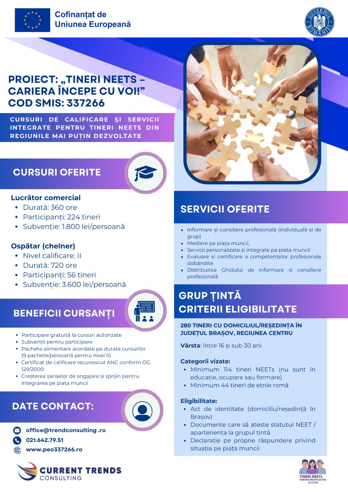 Proiectul „TINERI NEETs – Cariera începe cu voi!”, cod SMIS 337266, are ca obiectiv creșterea șanselor de ocupare și integrare pe piața muncii a tinerilor NEETs din județul Brașov, prin furnizarea de cursuri de calificare gratuite și servicii integrate de ocupare.