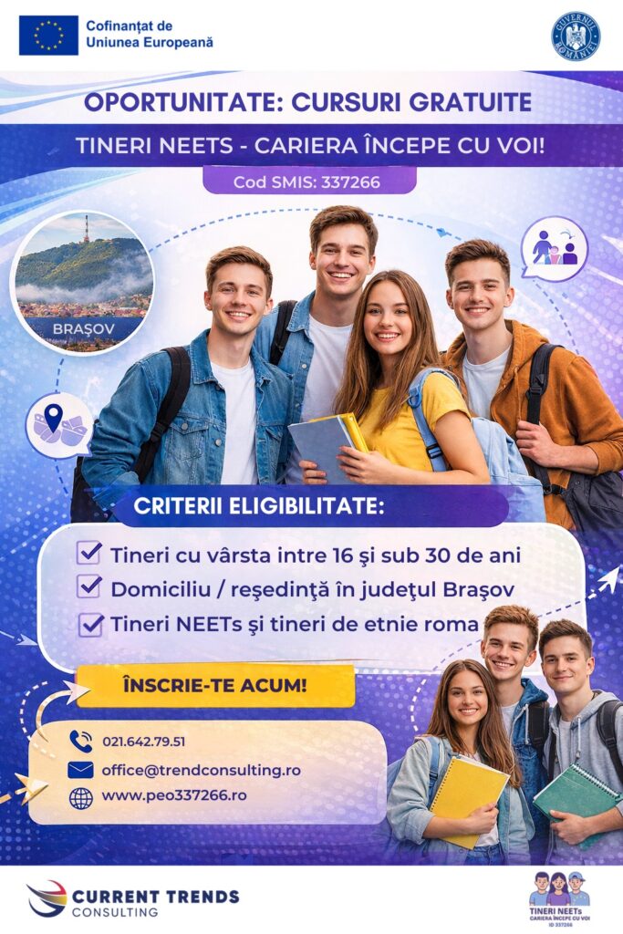 Dacă ai între 16 și sub 30 de ani, locuiești în județul Brașov și nu ești în prezent încadrat într-un loc de muncă sau într-o formă de educație, ai acum oportunitatea de a face un pas concret către o carieră stabilă.